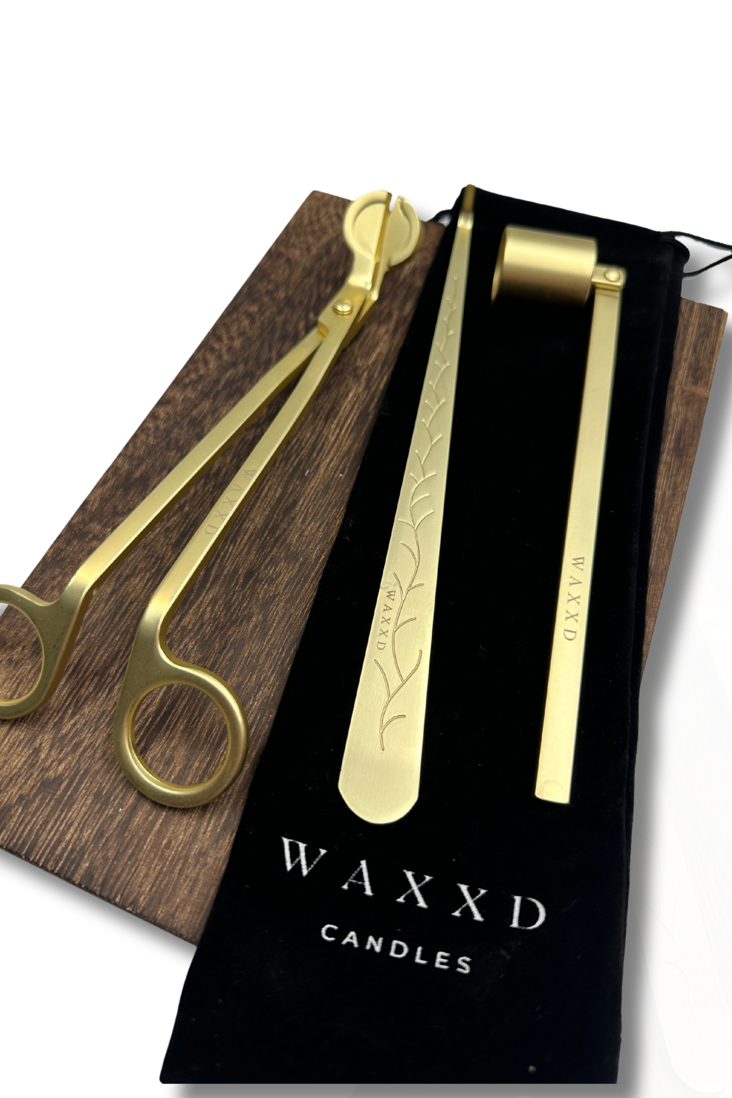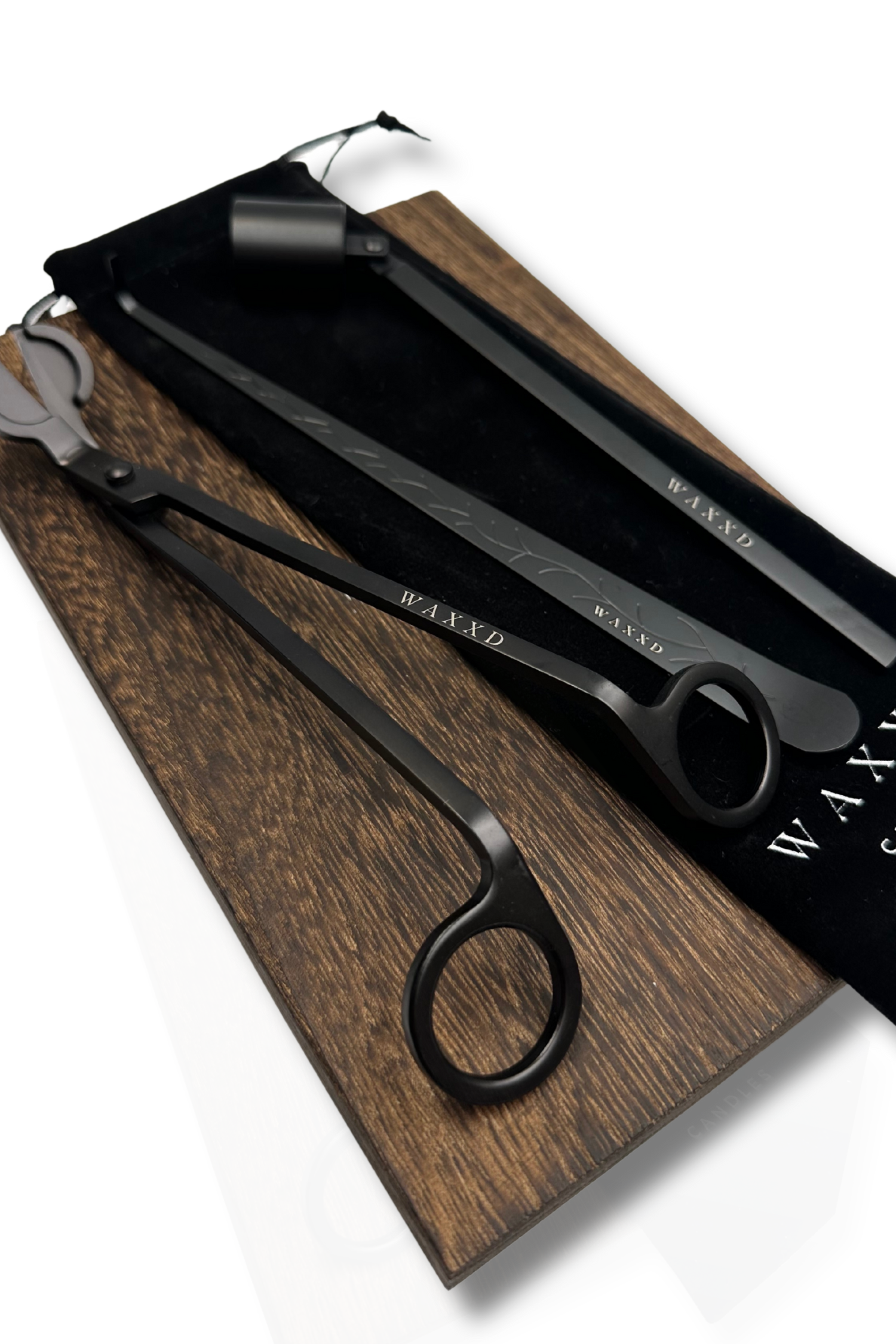 This set includes a wick trimmer, snuffer, & dipper, all packaged in a luxurious black velvet bag.
