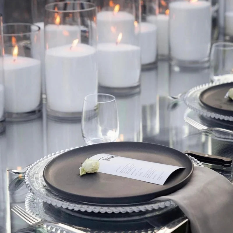 Glass cylindrical vases bring a classy and sophisticated look to any event table. They can be used as a focal point in the centre of your table or can be spread around the table or venue offering unique display options
